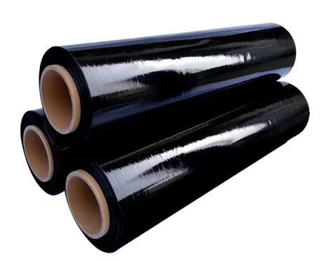 Wytrzymała folia stretch czarna o wadze 1,15 kg, przeznaczona do ręcznego owijania i ochrony produktów przed uszkodzeniami i zabrudzeniem.